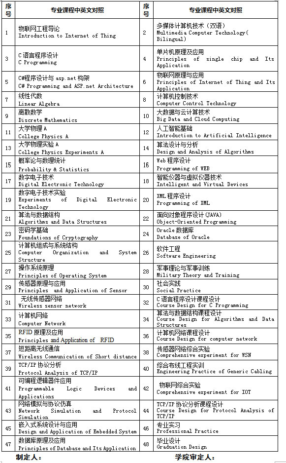 2.学位课程:C语言程序设计、算法与数据结构、计算机网络、射频识别技术、嵌入式系统设计与应用、无线传感器网络、物联网原理与应用、操作系统原理、传感器与检测技术、密码学基础、TCP/IP协议分析。