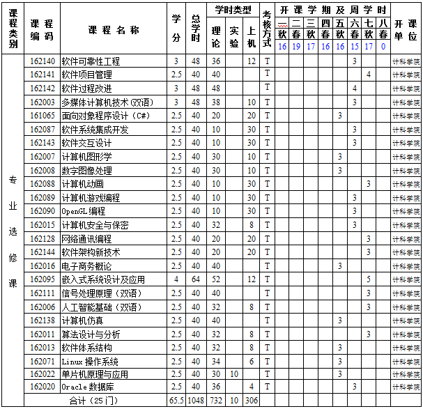 选修课(包括专业选修课和公共选修课)须修满29学分。学生应在下列专业选修课程中修满19学分;公共选修课的设置由学校提供。