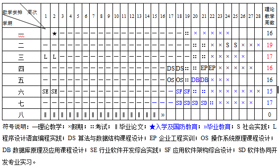 主要实践教学环节:军事理论与军训、社会实践、程序设计语言编程实践、数据结构课程设计、操作系统原理课程设计、数据库原理及应用课程设计、行业软件开发综合实践、应用软件架构综合设计、软件协同开发专业实习、毕业设计。