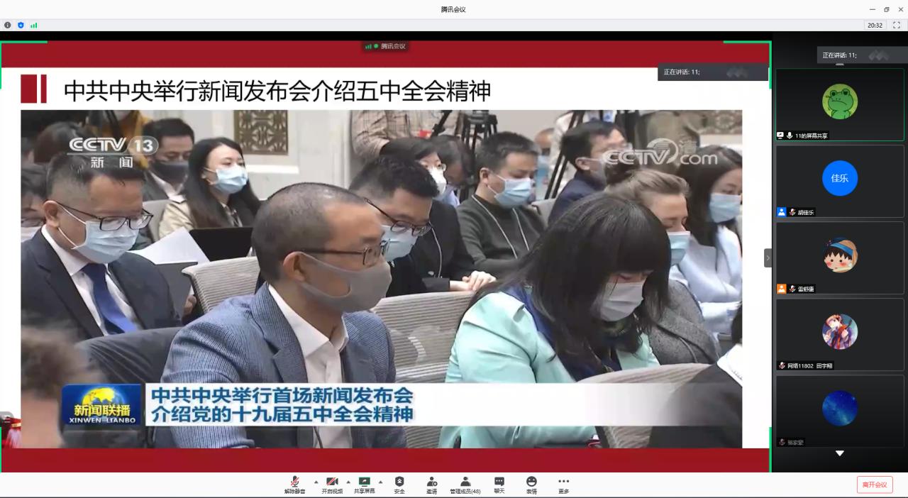 此次团会是采用线上线下结合方式,各支部团副在线上召开班团会,团会负责人宣读本次团会的相关事务和宣扬主题精神。给同学们讲解党的十九届五中全会相关内容传达其重要精神;随后组织同学们观看习近平在纪念中国人民志愿军抗美援朝出国作战70周年大会上的讲话视频;组织同学们观看习近平总书记给各大高校回信的视频及其原稿,并以4人小组形式就习近平总书记给高校师生的信件精神与致敬抗美援朝·争做时代新人展开讨论,每个小组推选出代表出来发言。最后团会负责人与同学们一起核对青年大学习完成情况,并进行总结。