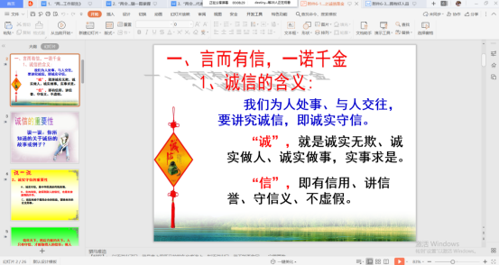 本次活动自5月25日开始,学院针对每个年级的特征,分别开展不同内容的教育活动,一、二年级开展诚信教育主题班会。由各班级自行组织,通过网上讨论、视频会议等方式,开展诚信宣传教育活动,树立诚信意识,引导大学生做一个有诚信、敢担当的人。