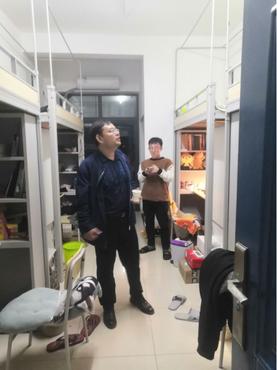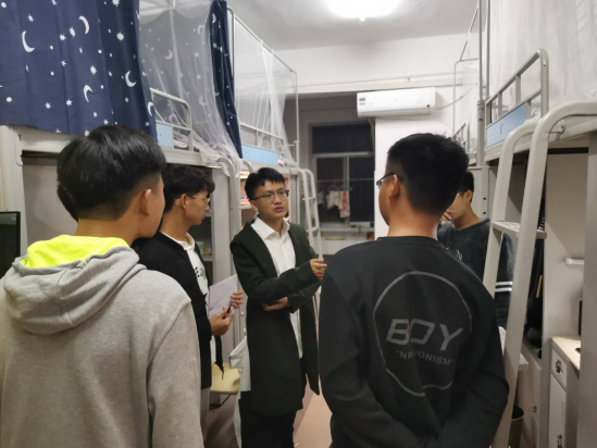 10月17日晚9:30,计科学院全体辅导员在颜学俊副书记带领下检查学生寝室,了解学生学习生活情况,提醒学生注意用电安全。