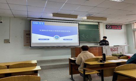 3位研究生依次登台演讲,分别围绕各自的研究方向,为同学们分享了3个课题。陈家俊同学分享的课题是大豆茎秆相关表型智能获取算法研究与应用;金思雨同学的题目时融入机器阅读理解的可回答问题生成算法研究与应用;曾天豪同学分享的课题是交通标志的小目标检测技术研究等内容。学术论文报告会已经成为同学们交流研究方向、研究进展的重要途径之一。在演讲过程中,老师们和同学们耐心听学术汇报,记录对于自己研究的进展有用的信息。每名研究生演讲完后,导师从多个角度对演讲人的汇报进行仔细点评,对其研究内容可能遇到的科研困难进行指导,通过点评让汇报人知道了自己一些不足的部分,有利于研究的进行。
