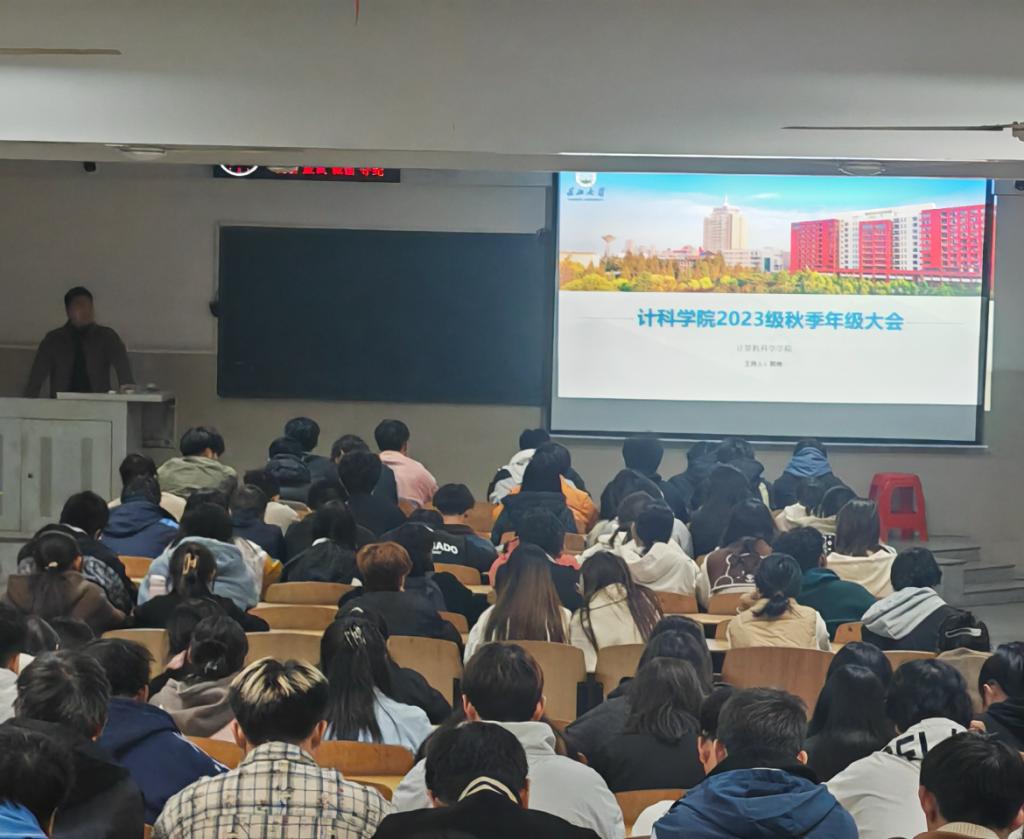 12月1日,计科学院在12教201、202举办了一次针对2023级学生的年级大会,旨在提高安全防范意识、预防电信诈骗,并为学生未来规划提供指导。会议由年级辅导员郭帅、王鹏翔主持,吸引了558名学生参与。