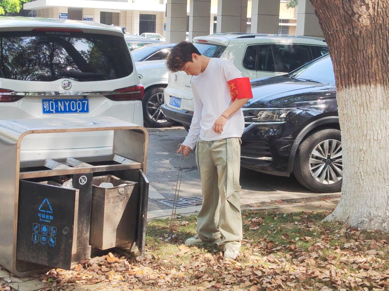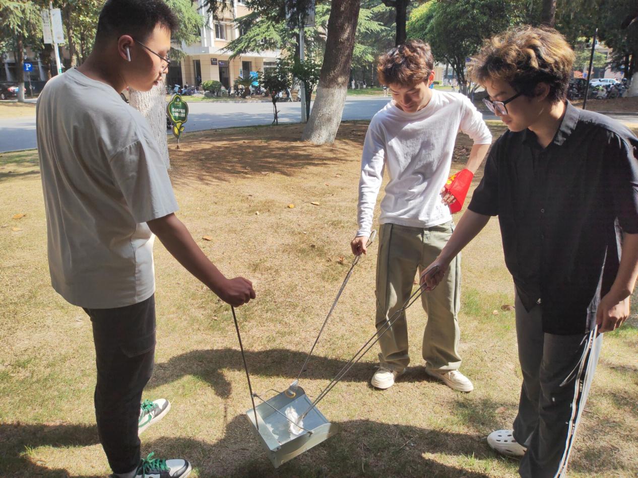在学院负责老师的带领下,学生们在学院楼前整齐集合,领取扫帚、垃圾夹、垃圾袋等清洁工具。尽管今天的阳光略显灼热,却丝毫未减同学们的劳动热情。在教学楼前,学生们俯身捡拾烟头、碎纸屑,细心擦拭栏杆上的灰尘;在绿化带中,大家戴上手套清理杂草和隐藏的塑料袋,将堆积的落叶装入垃圾袋。