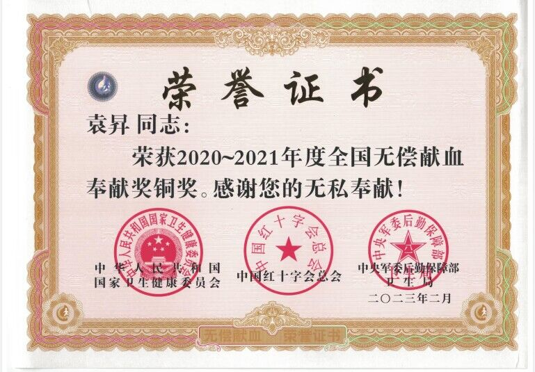 2023年,国家卫生健康委、中国红十字会总会、中央军委后勤保障部卫生局颁布《关于表彰2020-2021年度全国无偿献血表彰奖励获奖者的决定》,无码影片
