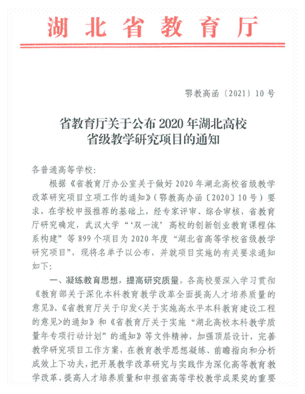 近日,湖北省教育厅印发了《省教育厅关于公布2020年湖北高校省级教学研究项目的通知》(鄂教高函[2021]10号),无码影片