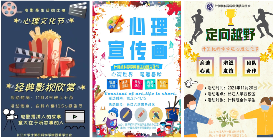 于2021年11月中上旬,顺利开展学院第六届心理文化节。此次文化节由三个子活动组成,分别是:沉浸心灵之旅——观影活动、共筑“心”青春——心理宣传画活动、智慧启迪心灵——定向越野活动。