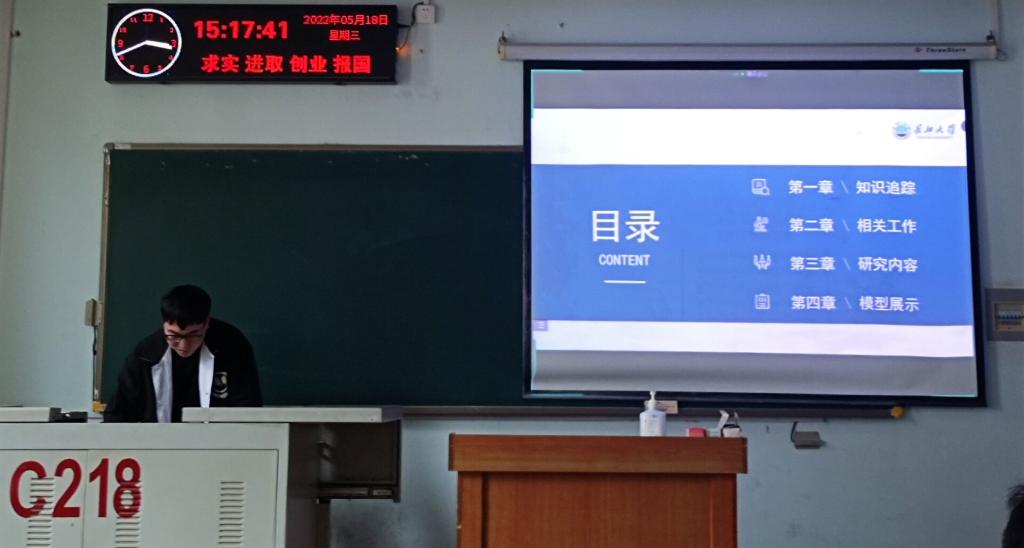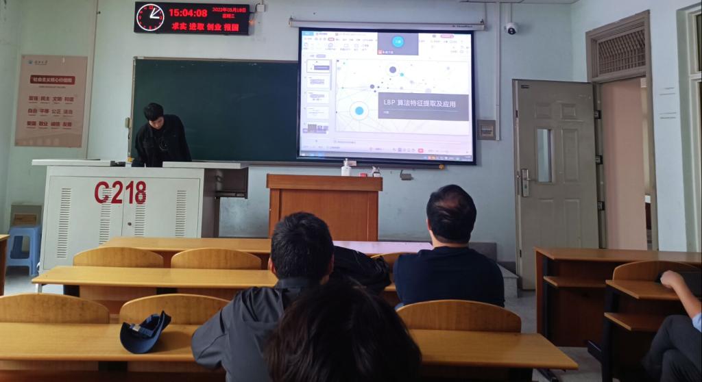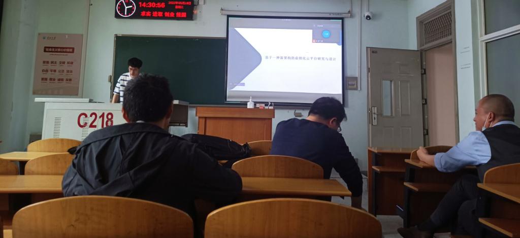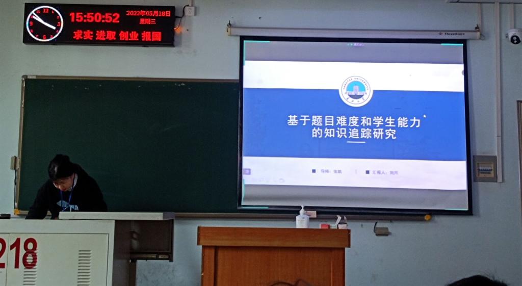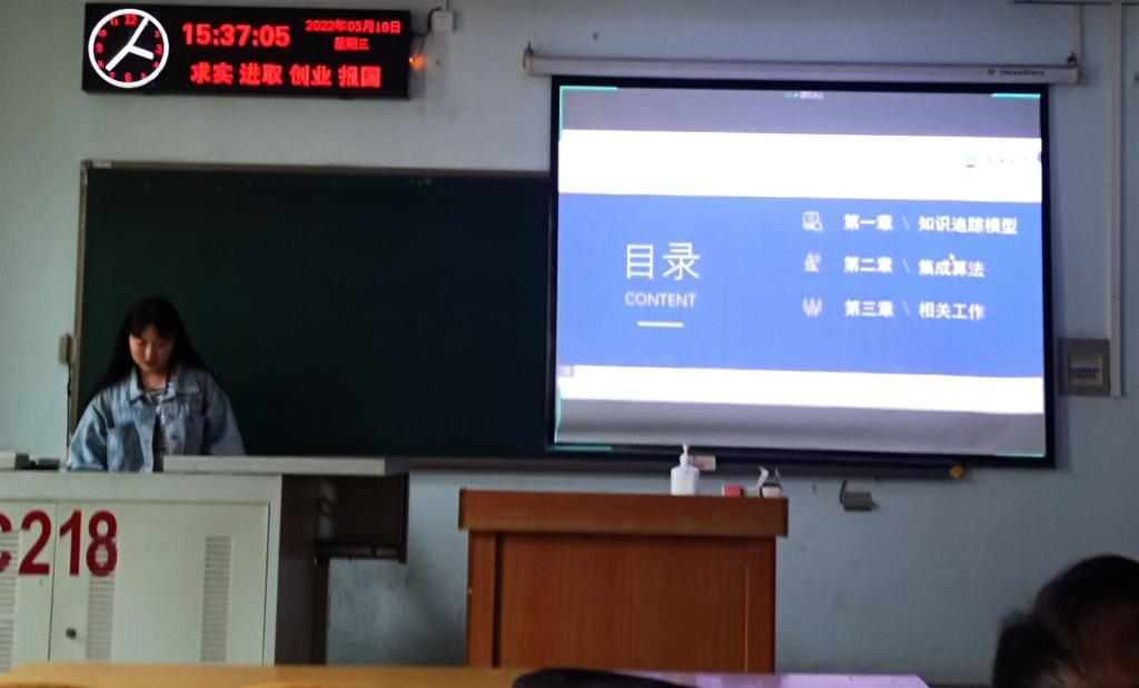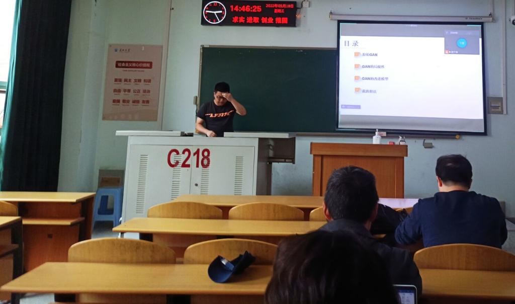 9位研究生依次登台演讲,分别围绕各自的研究方向,为同学们分享了9个课题:基于TCN的知识追踪研究,基于集成算法的知识追踪模型,深度GAN网络的数据增强算法研究,基于mopso的遥感图像融合,多注意模块的知识追踪模型,融合可分离卷积与剪枝的色觉测试图识别方法研究,LBP算法特征提取及应用,基于STM32的图像识别的研究与应用,基于一种新架构的虚拟化云平台研究与设计等内容。学术论文报告会已经成为同学们知识共享和传播的一种重要方式,在演讲过程中,导师与听众和演讲人针对相关研究成果互动、探讨。每名研究生演讲完后,四位导师从全方位对演讲学生的汇报进行仔细点评,对其研究内容可能遇到的科研困难进行指导,通过点评有效促进了研究生的成长。