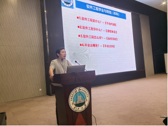 随后,王同喜老师围绕软件工程是什么?学什么?怎么学?毕业去哪里?四个问题,从宏观层面为同学们详细解读软件工程专业的定位、知识体系与学习要点、学习方法和职业规划,仿佛为同学们绘制了一幅清晰的专业地图。向华老师则化身“竞赛引路人”,详细介绍各类计算机与软件竞赛的情况,包括ACM、蓝桥杯等知名赛事,并简单介绍了参加这些竞赛的可操作路径,鼓励同学们在竞赛的舞台上磨砺专业能力。李梦霞老师从学风建设出发,语重心长地阐述学习习惯与方法的重要性,激励同学们以踏实的态度钻研专业技能。陈应霞老师提出软件工程专业育人宗旨:“以学生发展为中心,以提高培养质量为导向,以培养优秀人才为目标“。另外,陈应霞老师还详细介绍了本科导师制,要求还没有选定导师的同学尽快选好导师,确保每位同学都能得到帮扶和指导。