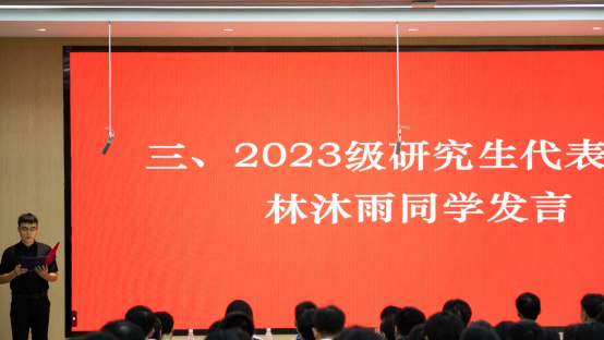 随后,2023级研究生代表林沐雨分享了个人在科研实践与学业探索中的心得,鼓励学弟学妹们以“不畏挑战、勇于探索”的态度,扎实走好研究生阶段的每一步;2025级研究生代表刘新凯表态,将以饱满的热情、务实的作风投入未来的学习与科研,不负学院与导师的期待。