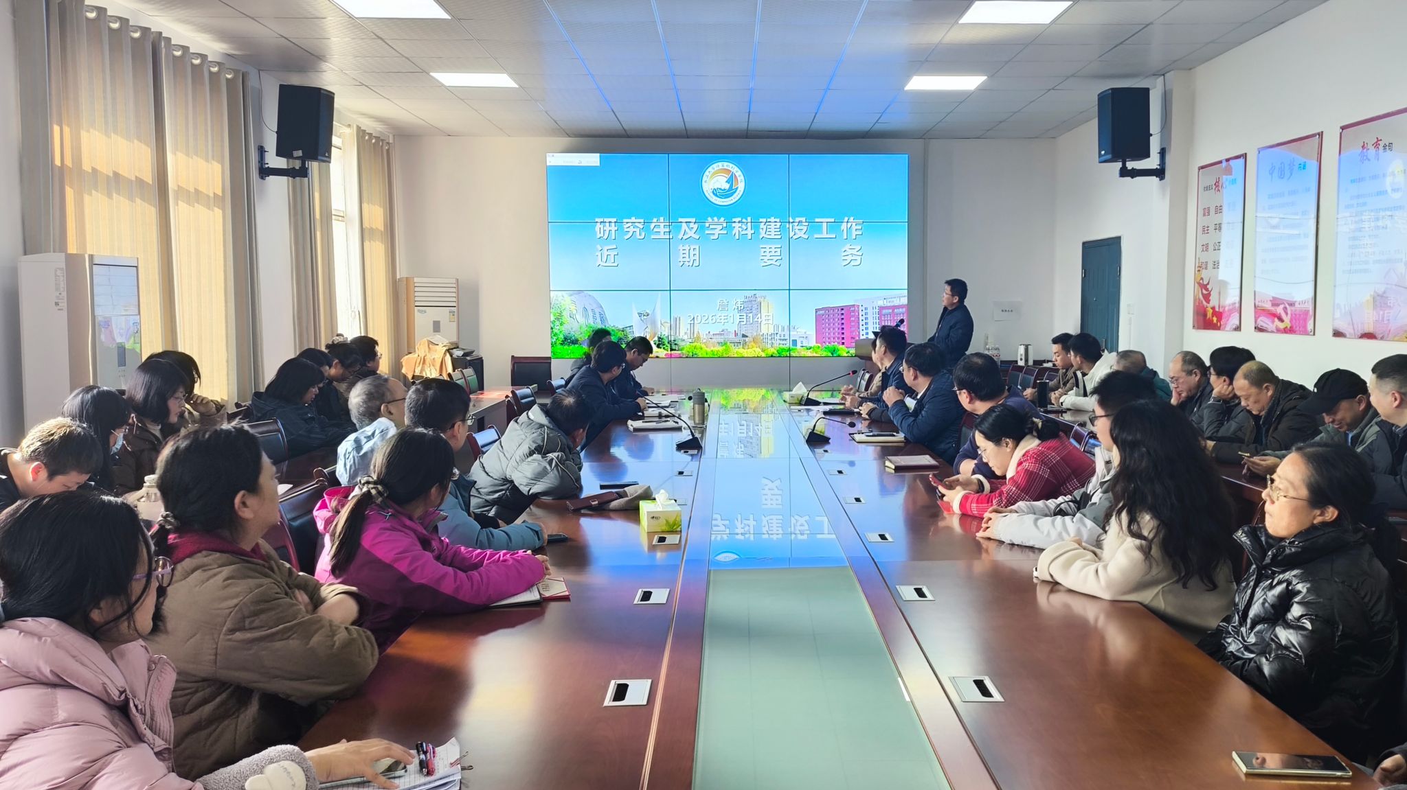 于5教501召开全体教职工大会,会议由崔艳荣院长主持,郑健书记及院领导班子成员出席,全体教职工参加会议。会议全面总结学院“十四五”发展成果,通报近期重点工作推进情况,部署寒假及后续各项工作任务,并对学院“十五五”发展进行战略谋划,为新学期、新发展阶段各项工作锚定方向、凝聚合力。