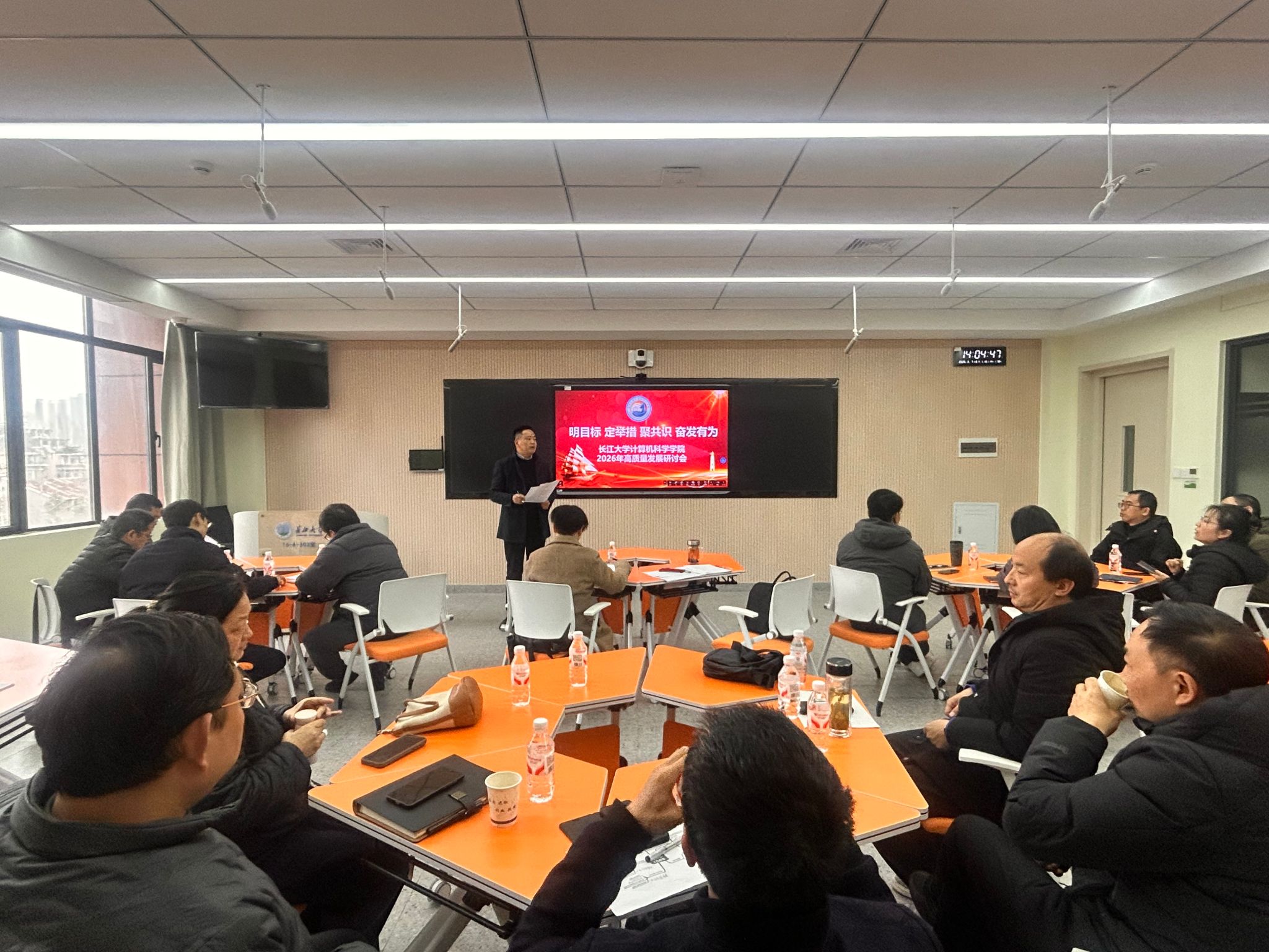 在16教A303会议室召开2026年高质量发展研讨会。学院班子成员、党委委员、各系部及实验中心负责人、各支部书记、机关行政管理人员参加会议。会议以"明目标定举措聚共识奋发有为——以实干实效推动学院高质量发展”为主题,坚持务实导向,聚焦关键问题,明确发展路径。