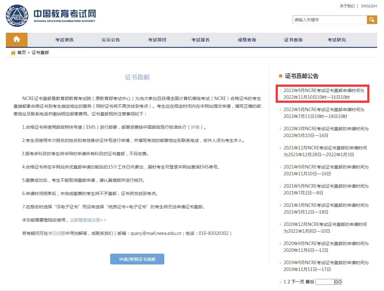 现已在中国教育考试网面向考生开通2022年9月全国计算机等级考试成绩查询和证书查询及电子证书下载,对获证且报名时选择“纸质证书+电子证书”的考生开通证书直邮申请服务。