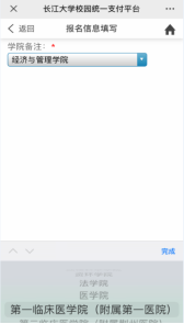 5、基础信息填写完后,务必在“学院备注”栏中正确选择参加复试的学院(参加附属第一医院复试的考生选择“第一临床医学院(附属第一医院)”、参加附属荆州医院复试的考生选择“第二临床医学院(附属荆州医院)”),最后点击“交费”即可。