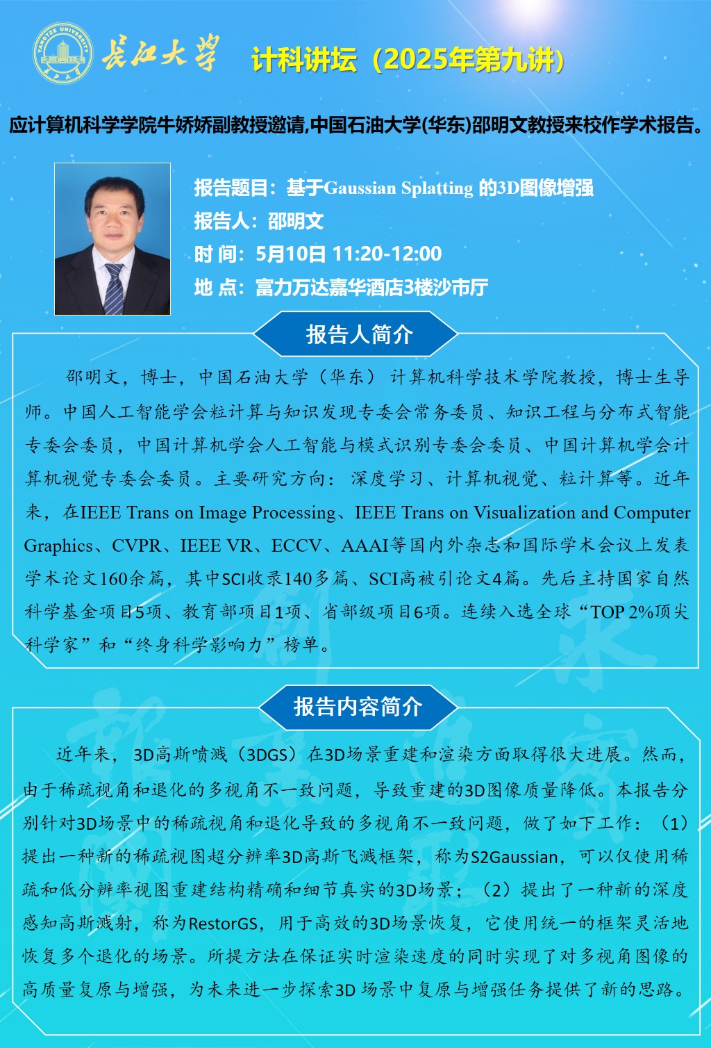 计科讲坛(2025年第九讲):基于Gaussian Splatting 的3D图像增强