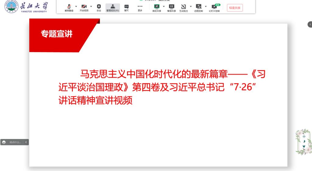 全体教职工还一起观看了《习近平谈治国理政》第四卷及习近平总书记“7·26”讲话精神宣讲视频《马克思主义中国化时代化的最新篇章》,力争不断深化对习近平新时代中国特色社会主义思想的理论逻辑、历史逻辑、实践逻辑的认识,在学深悟透的基础上科学实践,以奋进姿态迎接中共二十大胜利召开!