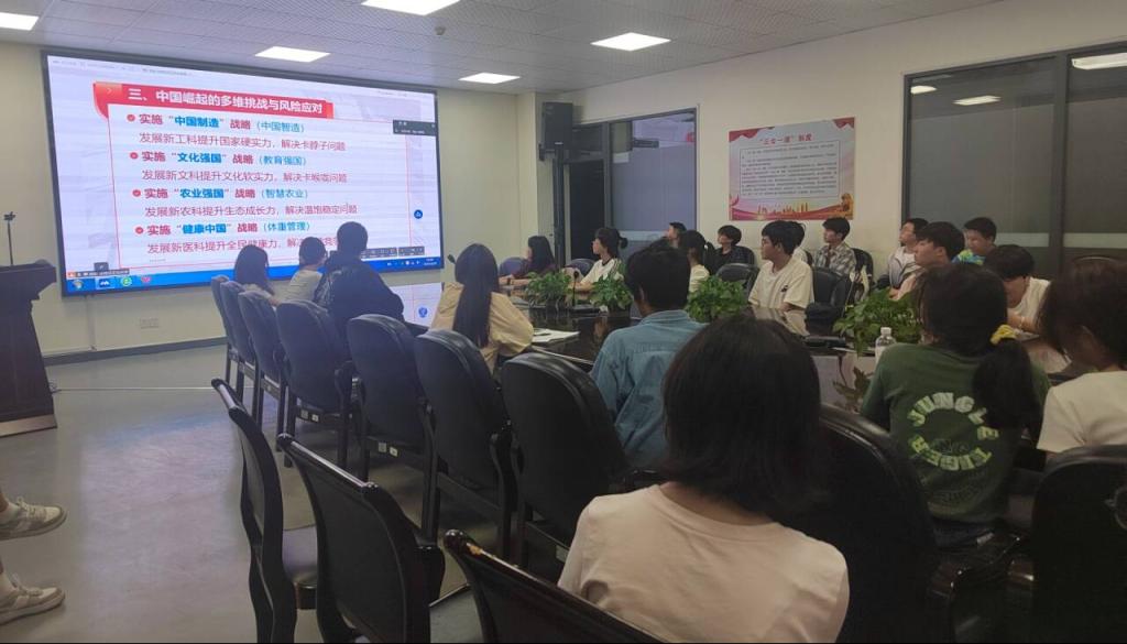 党课中,郑健从历史、人口、文明、国土、人性、世界、政权和发展等八大视角深入剖析中国崛起的必然性,阐释了中国特色社会主义道路的战略智慧,分析了中国崛起进程中的风险挑战及应对策略。他指出,实施“中国制造”“文化强国”“农业强国”等战略,是解决“卡脖子”问题、提升国家综合实力的关键举措。